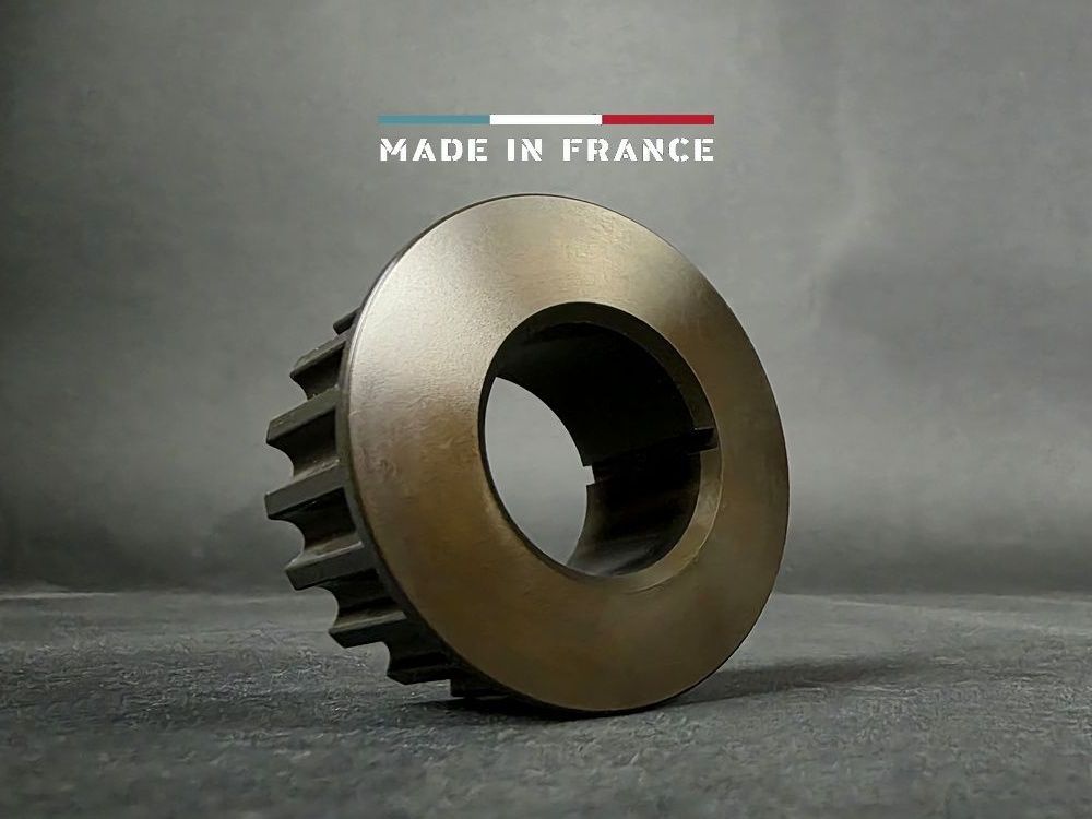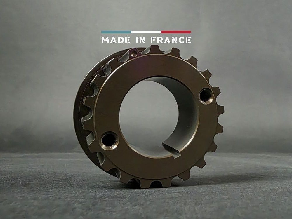 Fabriqué en France en aluminium 7075 puis traité anti-corrosion par anodisation dure, cette pièce d'orfèvrerie remplacera avantageusement un pignon en acier d'origine.
