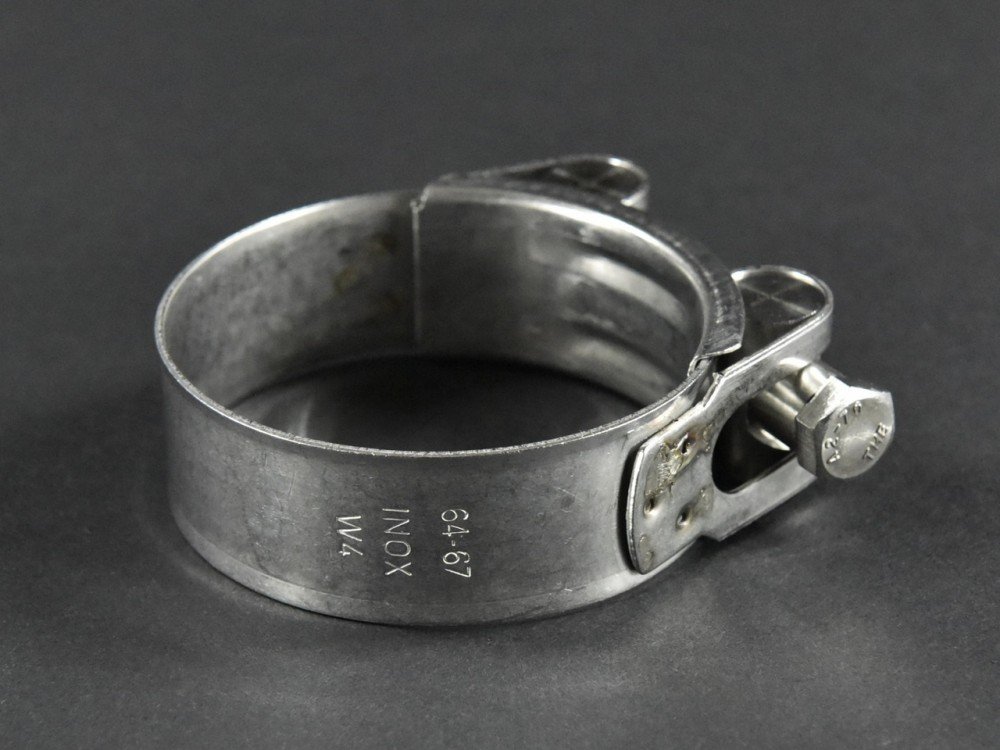 Collier de serrage spécial échappement en acier inoxydable extra large de 25 mm. Résistance haute tension (jusqu'à 35 Nm) avec vis M8 à tête hexagonale galvanisée et trempée.