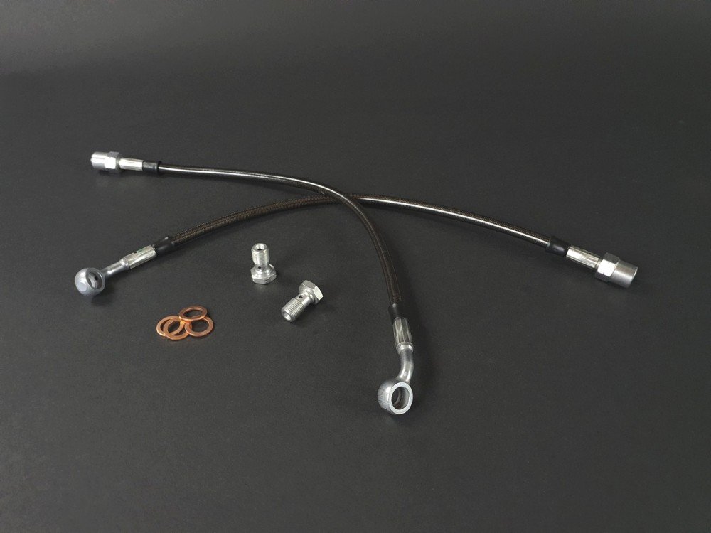 Flexibles de freins avants type aviation gainés (et donc homologués contrôle technique) en noir du fabricant Goodridge spécifiques pour le montage des étriers de 406 coupé V6 sur R11 turbo phase 1 ou 2.