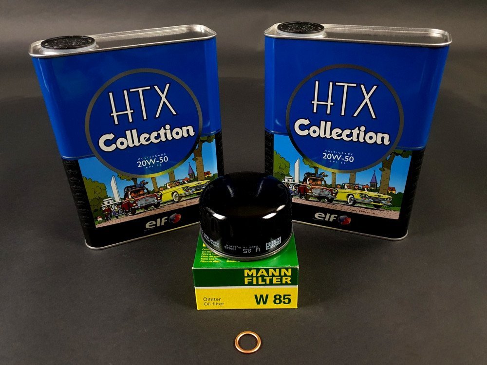 Pack composé de 2 bidons de 2 litres d'huile Elf HTX Collection 20w50, d'un filtre à huile Mecafilter et d'un joint de bouchon de vidange cuivre.