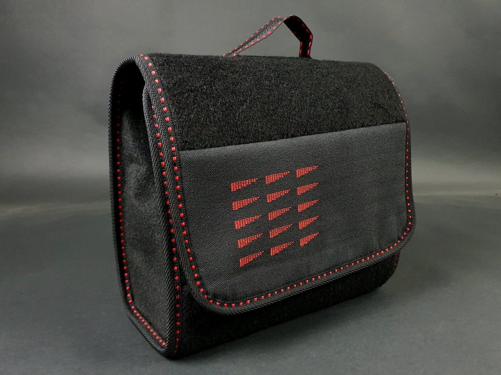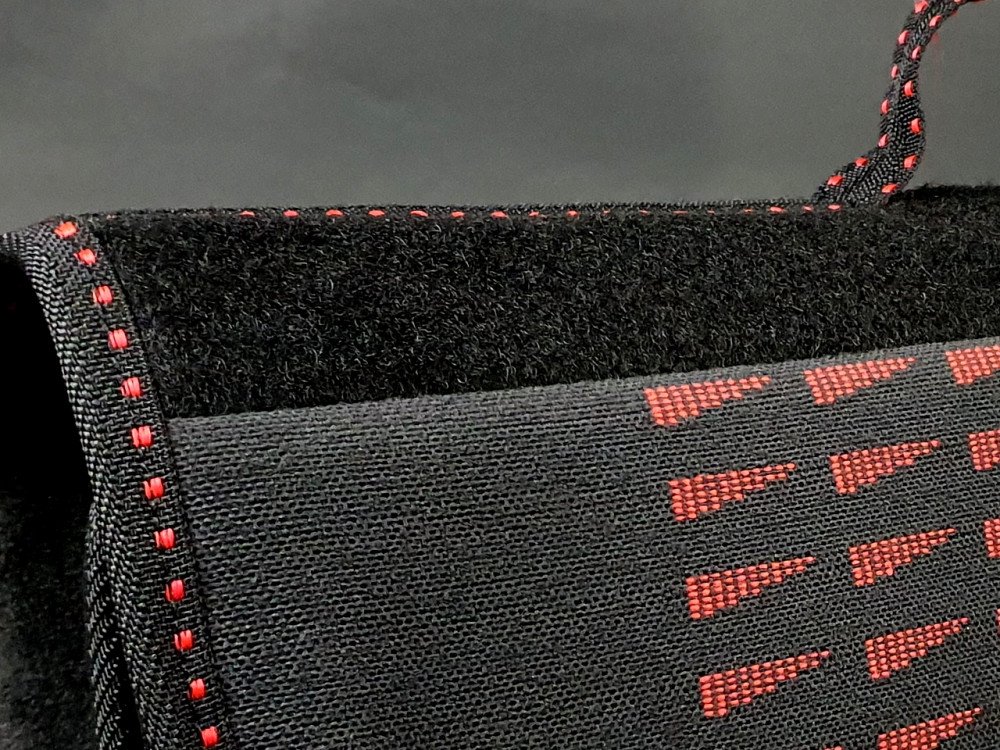 Surpiqures rouges, velcros intégrés pour le maintien sur la moquette du coffre ou les passages de roue ainsi que pour la fermeture.