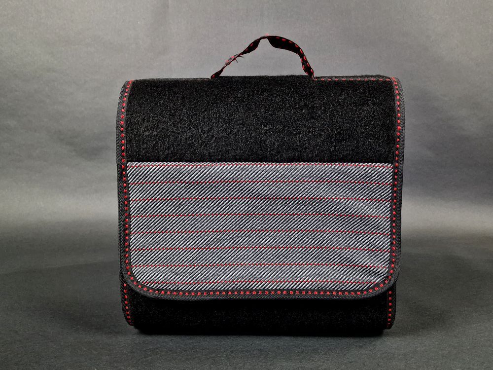 Surpiqures rouges, velcros intégrés pour le maintien sur la moquette du coffre ou les passages de roue ainsi que pour la fermeture.